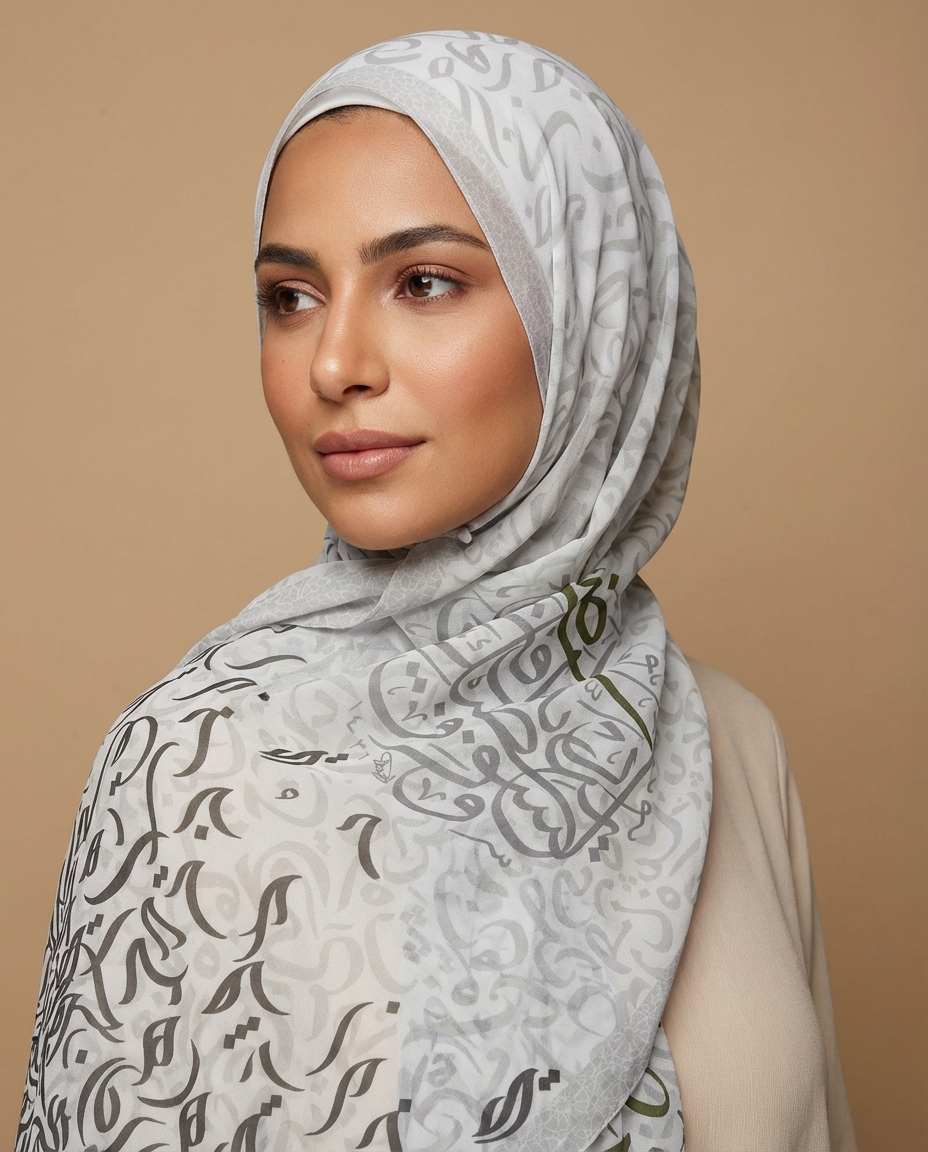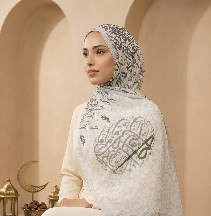 Fatarḍa is a refined scarf inspired by the depth of Arabic calligraphy and timeless black tones. Designed to reflect inner peace and quiet strength, it drapes gracefully, offering an elegant presence that feels both powerful and serene.