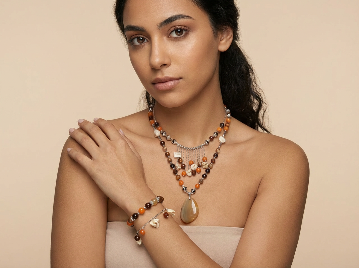 Warm earthy stones (Tiger’s Eye) and organic shell accents (Carnelian) , finished with a natural statement pendant. A piece that reflects grounded beauty, softness, and natural harmony.