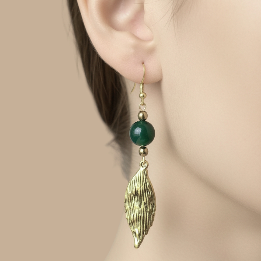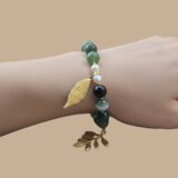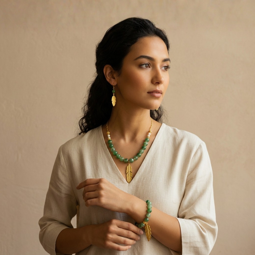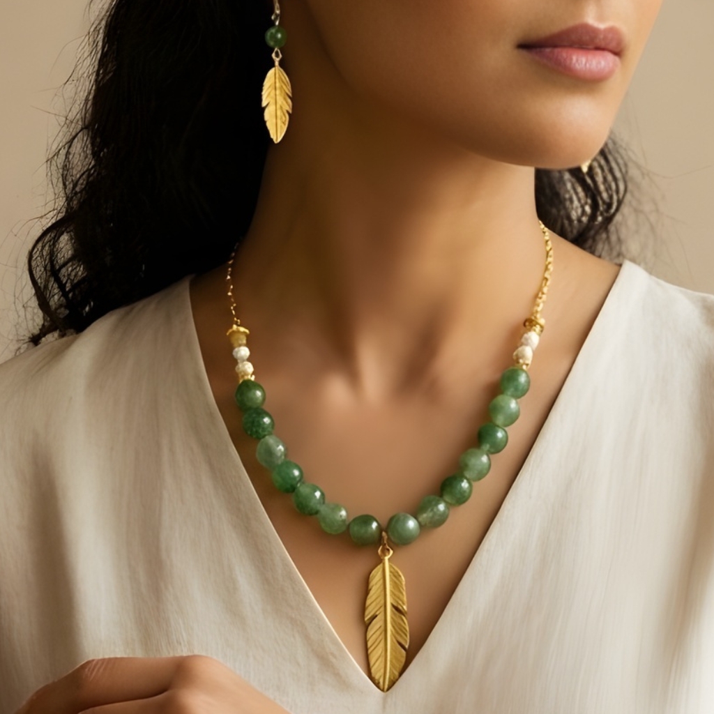 A handcrafted jewelry set inspired by nature, featuring soft green natural stones and delicate gold-tone leaf details. A graceful piece that reflects growth, balance, and timeless femininity.