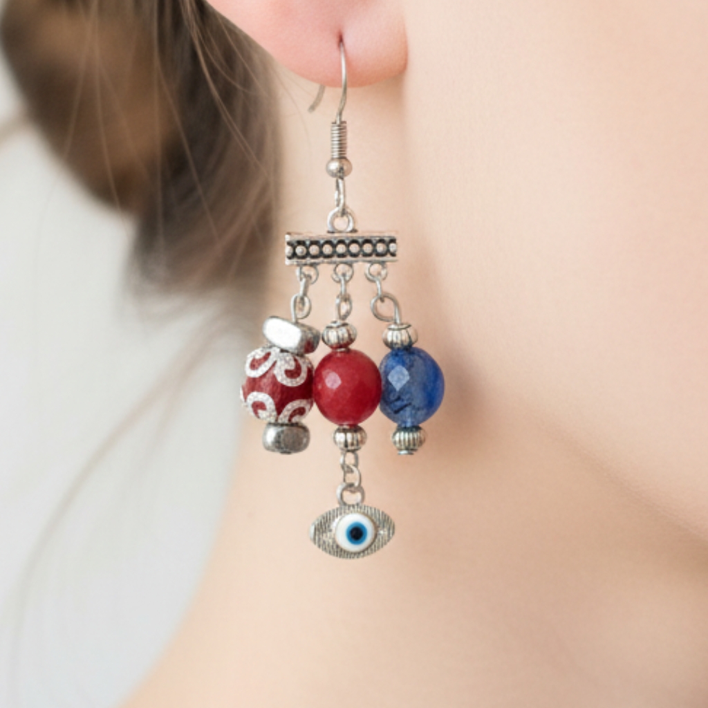 A Vibrant red Agate and soft blue Dyed Quartz natural stones, delicately accented with silver-toned details. A balanced piece that blends color, rhythm, and timeless character.