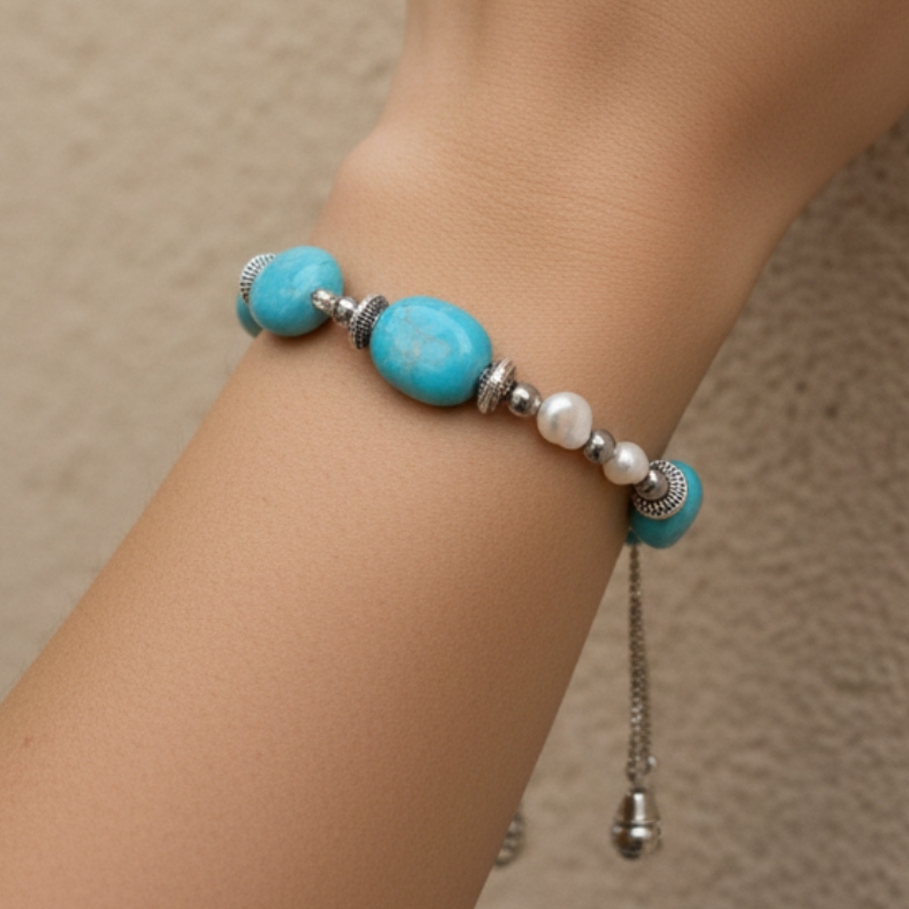 Materials : Blue Howlite, Pearl-Tone Beads , Stainless steel Dimentions