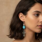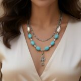 A handcrafted layered necklace blending serene turquoise tones with delicate silver accents, finished with a symbolic cross pendant. A graceful piece that reflects balance, faith, and timeless sophistication.