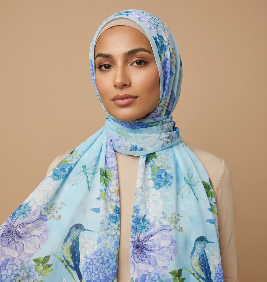 Waad Elbanafseg is a light, flowing scarf inspired by soft sky tones, delicate florals, and the quiet freedom of nature. Airy and graceful, it drapes effortlessly to bring freshness and calm elegance to your look.
