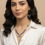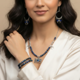 A handcrafted jewelry set inspired by ancient symbolism, featuring deep blue natural stones and silver-toned charms, centered with the Eye of Horus. A refined piece that blends protection, strength, and timeless elegance.