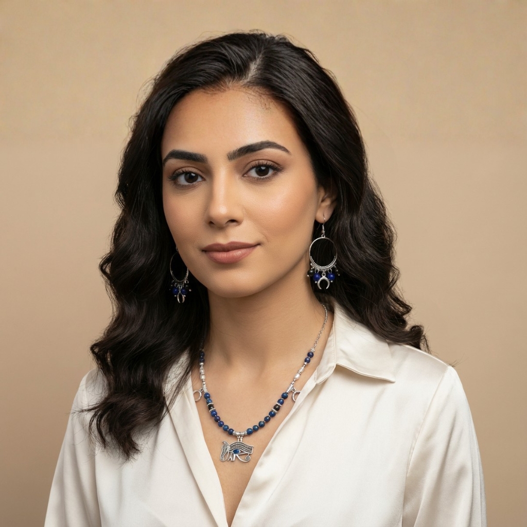 A handcrafted jewelry set inspired by ancient symbolism, featuring deep blue natural stones and silver-toned charms, centered with the Eye of Horus. A refined piece that blends protection, strength, and timeless elegance.