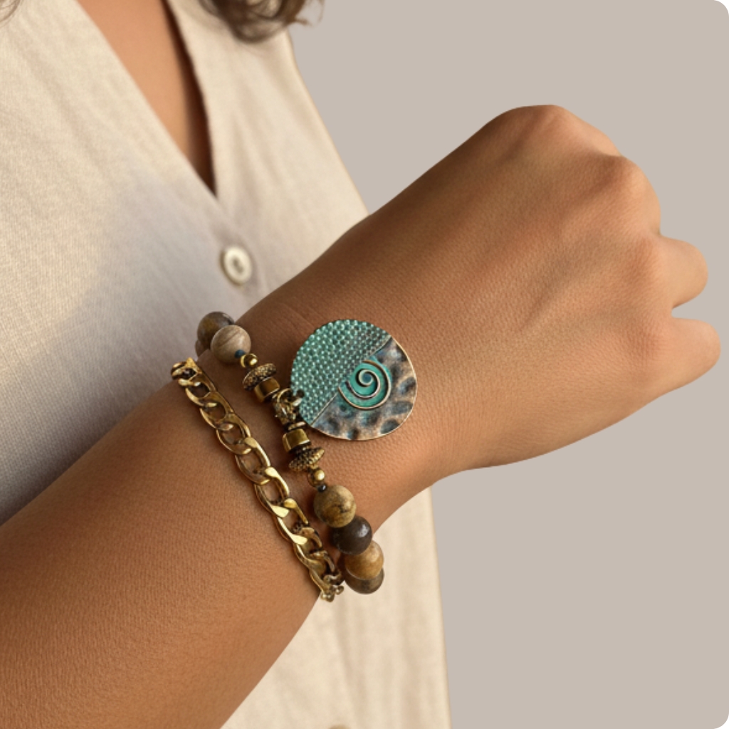 A handcrafted necklace designed with soft neutral tones and natural textures, featuring earthy stones and a delicate circular pendant. A refined piece that reflects calm strength, balance, and understated elegance.