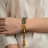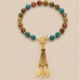 Multicolored natural stones, finished with a delicate gold-tone tassel. A flowing piece that celebrates movement, warmth, and effortless elegance.