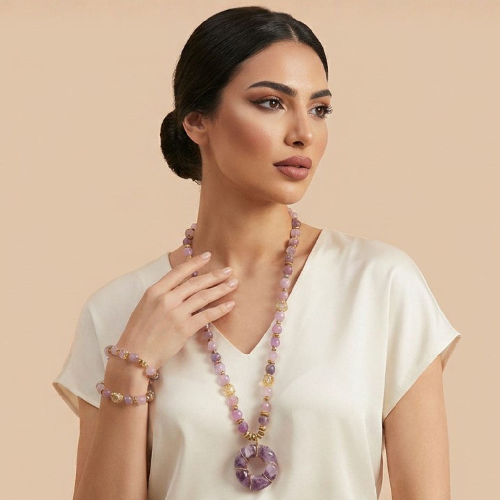 Natural Amethyst stones and a sculptural statement pendant. Soft, feminine, and quietly expressive.
